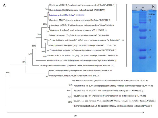 The protein structure analysis and molecular weight of the C. amphilecti KMM 296 protease CamSP: (A) Phylogeny reconstruction for protease CamSP and closest relatives using the Maximum Likelihood method and JTT matrix-based model (MEGA11, http://www.megasoftware.net/, accessed on 20 April 2023); (B) SDS-PAGE of the purified recombinant protein CamSP (line 1); M—molecular weight marker (BioRad).