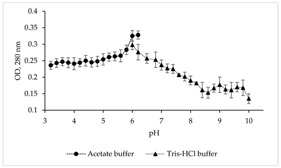 The protease activity was determined using the method described earlier [28], using 1% casein or bovine serum albumin (BSA) as the substrates (Sigma-Aldrich, St. Louis, MO, USA). The enzyme solution, diluted to the required concentration, was mixed with 0.5 mL of 50 mM Tris-HCl buffer, pH 7.5, containing 1% casein (or BSA) and incubated for 20 min at 50 °C. The reaction was stopped by adding cold 10% trichloroacetic acid (TCA). The acid-soluble product was determined spectrophotometrically at a wavelength of 280 nm. The standard curve was built using the solutions of tyrosine at a concentration of 0–100 µg L−1. One unit (U) of protease activity was defined as the amount of the enzyme that releases 1 µg of tyrosine in 1 min under the experimental conditions used. Protease activity is the average of two measurements taken in triplicate. The difference between the values did not exceed 5%.