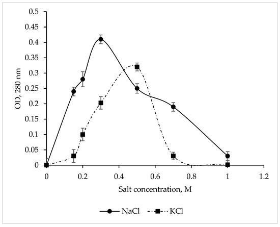 The CamSP protease exhibited maximum activity at 0.3 M NaCl and 0.5 M KCl (Figure 3), while Na+ and K+ salts at a concentration of 1 M completely inhibited the enzyme. These results are in complete agreement with the data obtained for CamSP in silico using the ProtParam program (http://web.expasy.org/protparam/, accessed on 20 April 2023) [44]. The C. amphilecti KMM 296 alkaline phosphatases CmAP and CmPhoD have the same moderate salt dependence, indicating their extracellular functions and the marine environment habitat of their producing microorganism [45,46].