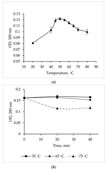 The temperature dependence study showed that the maximum activity of the C. amphilecti KMM 296 protease is at 50 °C, but the enzyme activity remained at a high level in a temperature range of 45–55 °C (Figure 4a).