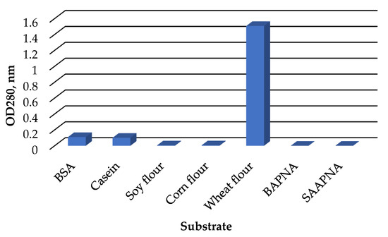 The C. amphilecti KMM 296 protease CamSP exhibited the proteolytic activity towards natural substrates, such as casein, bovine serum albumin, and wheat flour proteins (Figure 5). However, CamSP did not degrade soybean, corn, and synthetic substrates α-benzoyl-Arg-p-nitroanilide (BAPNA), N-Succinyl-L-alanyl-L-alanyl-L-prolyl-L-phenylalanine 4-nitroanilide (SAPNA) (Figure 5).