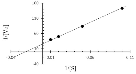 The Lineweaver–Burk plot for C. amphilecti KMM 296 protease CamSP was built based on the initial rates for BSA as the substrate at different concentrations and at a temperature of 50 °C (Figure 6). Based on the Lineweaver–Burk plot, the kinetic parameters for CamSP are Vmax = 0.036 µg/mL min−1 and Km = 41.7 µg/mL, 1/2 Vmax = 0.018 µg/mL min−1, kcat = 529.42 min−1, and kcat/Km = 14.706 min−1.