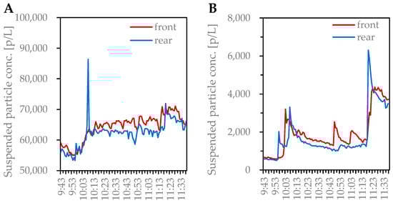 Change over time in suspended particle concentration by particle size (screening 1 in theater E). (A): Suspended particle concentration of <1 μm; (B): >1 μm suspended particle concentration.