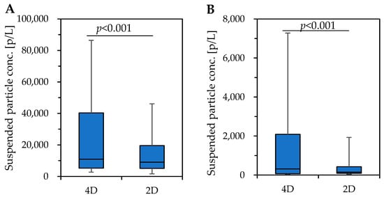 Comparison of suspended particle concentrations during 2D (9 screens) and 4D (15 screens) movie performances. (A): Suspended particle concentration of <1 μm; (B): >1 μm suspended particle concentration.