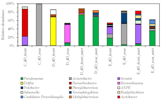 A total of four genera, namely Pseudomonas, Acinetobacter, Pedobacter, and Brevundimonas, were detected in both 4D and 2D movie theaters at a relative abundance of 1% or higher. Other than the above four genera, the bacterial genera Serratia, Delftia, Paenarthrobacter, Phenylobacterium, Allorhizobium-Neorhizobium-Pararhizobium-Neorhizobium, Salmonella, Novosphingobium, Bradyrhizobium, Candidatus Protochlamydia, and Methylobacterium were detected in 4D theaters with a relative abundance of 1% or higher (Figure 3 and Figure 4). Serratia are Gram-negative rods belonging to the Enterobacteriaceae family; they are commensal bacteria that are usually found in soil, water, and air. Serratia marcescens is a nosocomial pathogen []. Delftia is a Gram-negative opportunistic pathogenic environmental bacterium []. There is a report on the taxonomy of Paenarthrobacter [], but there are few reports of studies in which it is predominantly detected in the built environment. Phenylobacterium is a Gram-negative rod bacterium. The first case of cutaneous infectious granuloma caused by this bacterium was reported in 2010 []. Allorhizobium–Neorhizobium–Pararhizobium–Neorhizobium has been detected and reported in soil [] and residential settings []. Salmonella is a Gram-negative bacterium that is widely distributed in nature, including the intestinal tracts of animals such as chickens, pigs, and cattle, as well as rivers and sewage []; Novosphingobium has been detected in lakes []; Bradyrhizobium has been detected in soil and water and reported to survive for over one year in distilled water []; Candidatus Protochlamydia have been detected in groundwater []; and Methylobacterium is a biofilm-forming bacterium that is frequently detected in bathrooms [].