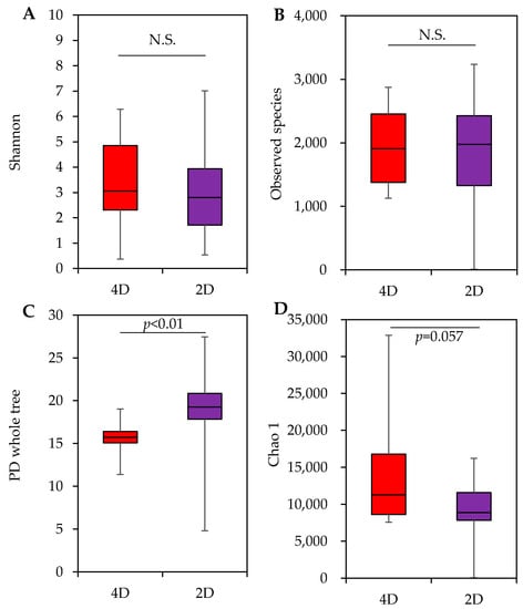 Comparison of the alpha diversity of adherent bacteria between 4D and 2D theaters. (A): Shannon Iindex between 4D and 2D theaters; (B): Observed species; (C): PD whole tree between 4D and 2D theaters; (D): Chao 1 between 4D and 2D theaters.