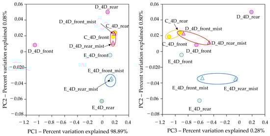 Beta diversity was shown via principal coordinate analysis (PCoA) using the weighted UniFrac distance. The results of the principal coordinate analysis show that the bacterial flora on the front and rear mist outlet surfaces in the 4D theaters D and E and the floor-adherent bacterial flora in the front and rear of the 4D theater C were similar. On the other hand, the flora in the fronts and rears of theater D and theater E were different (Figure 6).