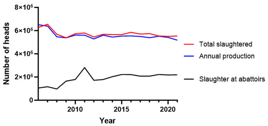 The median number of pigs in the national herd recorded at the beginning of each year from 2006 to 2021 was 3.26 million, while the median pig production was 5.8 million (Table S2). The median number of slaughtered pigs over the same period was 5,687,000, which represents nearly the entire annual production after accounting for mortality, yet only 2,055,243.5 heads (36.1%) were slaughtered at abattoirs (Figure 1). The median annual mortality was 267,000 (4.6% of the production) andshowed a decreasing trend over the years (Table S2). The median annual pork production in the last 15 years was 274,500 tons of meat. There has been a constant reduction in the number of pigs since 2007, from 4 million heads at the beginning of the year to 2.9 million at the beginning of 2021, which is a net reduction of 25.5% (Table S2).