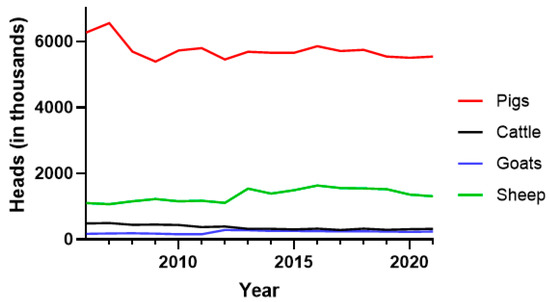 From 2006 to 2019, 357,000 heads were exported in total (data for 2020 and 2021 are not available yet), while the sum of imported live pigs in the same period was slightly over 1.4 million heads, yielding a ratio of 3.9:1 in favor of imports (Table S2). The amount of imported meat (fresh and frozen) and meat products represents 10–20% of the domestic median annual meat production in the last 15 years [37].
