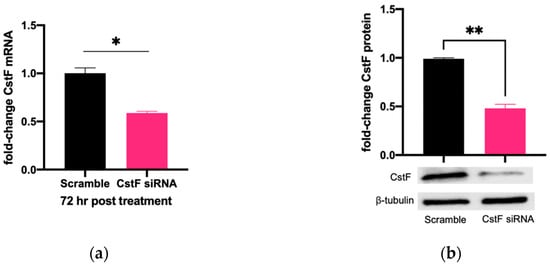 Proteins were harvested using a RIPA buffer (Merck, KGaA, Darmstadt, Germany). All the protein samples were diluted 1:1 in Laemmli buffer (Merck, KGaA, Darmstadt, Germany) and heated at 95 °C for 5 min before running the gel. Proteins were separated using sodium dodecyl sulfate–polyacrylamide gel electrophoresis (SDS–PAGE) using 4–20% Mini-PROTEAN TGX Precast Protein Gels (Bio-Rad Laboratories, Hercules, CA, USA). They were transferred to the nitrocellulose membrane through the Trans-Blot Turbo Transfer System (Bio-Rad Laboratories, Hercules, CA, USA). Next, the membrane was processed and stained using the iBind Western system (Thermo Fisher Scientific, Waltham, MA, USA) and primary antibodies specific for CstF (1:2000 dilution of #SAB2700222, Sigma-Aldrich), ß-tubulin (1:4000 dilution of #ab6046, Abcam, Cambridge, UK), and horseradish peroxidase (HRP)-conjugated secondary antibody (1:4000 dilution of #1706515, Bio-Rad Laboratories, Hercules, CA, USA). The visualization of bands was performed through chemiluminescence using an NZY Supreme ECL HRP Substrate (NZYTech, Lisbon, Portugal) in a ChemiDoc XRS+ System (Bio-Rad Laboratories, Hercules, CA, USA). The band intensity was quantified using ImageLab software on USB drive #12012931 (Bio-Rad Laboratories, Hercules, CA, USA).