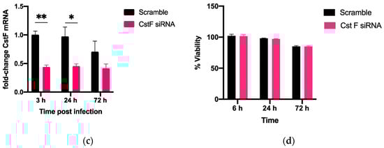 siRNA-mediated gene silencing effectively decreases CstF expression in human macrophages. To achieve maximum silencing, CstF was silenced by siRNA 3 days prior to infection with Mtb. (a) Relative gene expression of CstF mRNA in macrophages was obtained using RT-qPCR after 72 h of transfection. (b) The Western blot image demonstrates the silencing of the CstF protein by siRNA at the moment of infection. The respective bar plot was calculated from two independent experiments measuring band intensity using β-tubulin as a calibrator. The error bars represent the standard error of the mean. (c) RT-qPCR measured the relative gene expression of CstF mRNA in transfected cells 3 h, 24 h, and 72 h post-infection. The bar plots represent the average of three independent experiments, and the error bars demonstrate the standard error of the mean. (d) Effects of silencing on the viability of cells transfected with siRNA for CstF relative to scramble transfected cells. This was measured using PrestoBlue (resazurin-based solution) and quantifying the fluorescence emission in a plate reader. Untreated macrophages with 100% viability and 0.05% Igepal-treated macrophages with 0% viability were used as controls. * p < 0.05, ** p < 0.01.