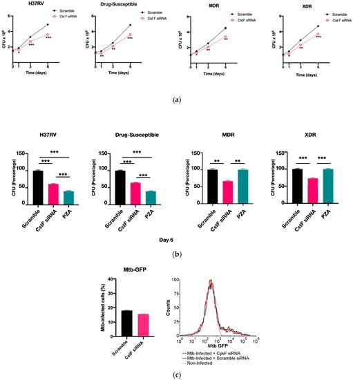 CstF is primarily expressed in the immune cells, most prominently in dendritic cells, T cells, and NK cells []. We decided to investigate the expression of this endogenous protein inhibitor in primary human macrophages, specifically during Mtb infection. Therefore, we targeted CstF through siRNA-mediated gene silencing as previously established in primary human macrophages []. To evaluate the impact of CstF silencing on macrophages’ response to Mtb infection, the quantification of the intracellular survival of Mtb was performed through colony forming units (CFU) counts of bacteria recovered from infected cells over six days (Figure 2a). The results indicate a significant impact on the macrophages’ killing ability towards all Mtb strains, whether the Mtb reference laboratory or clinical strains with different drug resistance profiles. Figure 2a,b show a significant reduction in CFU from bacteria recovered from CstF-silenced infected macrophages compared to scramble controls (p < 0.001). To assess if the effects on CFU counts were not affected by differences on the ability of macrophages to internalize bacteria, the amounts of Mtb in CstF-silenced macrophages was compared to those in the scramble control using flow cytometry. The results indicate similar amounts of bacteria in both conditions (Figure 2c). Moreover, the results, indeed, show no interference of cell death when comparing clinical and reference strains that could impact differences on CFU counts (Figure 2d). Overall, these results together with previous results (Figure 1d) showing no cytotoxic effects due to CystF silencing, indicate that the modulation of CstF expression in macrophages significantly impacts the intracellular killing of Mtb infection.