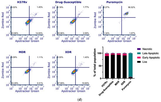 Macrophages were infected for three hours with a GFP-expressing Mtb strain to quantify bacterial internalization or with non-fluorescent H37Rv and clinical strains to quantify cell death. Macrophages were washed with PBS following three hours of infection and immediately detached (internalization experiments) or incubated for an additional three days (cell death experiments). Infected macrophages were detached using accutase. For cell death staining, Apotracker Green and Zombie Red (Biolegend, San Diego, CA, USA) dyes were used to stain apoptotic and dead cells, respectively. Furthermore, they were fixed in 4% paraformaldehyde for an hour and then analyzed in a Cytek® Aurora flow cytometer (Cytek® Biosciences, Fremont, CA, USA). Data analysis was performed in FCS Express 7 (De Novo Software, Pasadena, CA, USA).