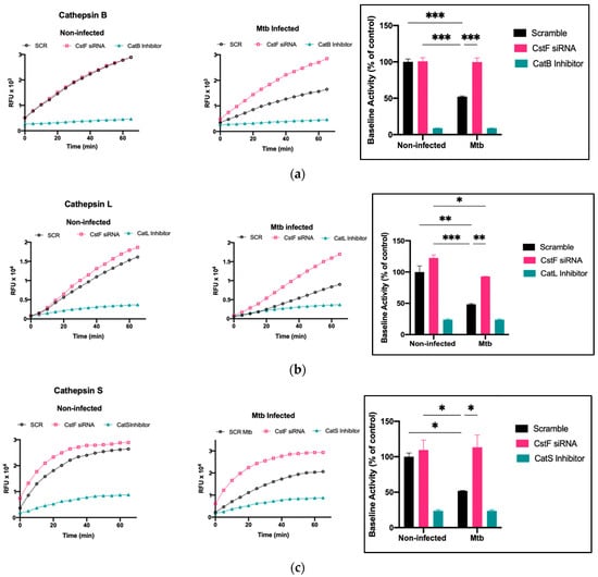 The modulation of CstF expression impacts the intracellular survival of Mtb in human macrophages during infection. To investigate whether the intracellular killing of Mtb was attributed to an effect on cathepsins, the proteolytic activity of cathepsins was evaluated. The activity of several cathepsins, including cathepsins B, L, and S, was measured over one hour starting at 24 h post-infection using fluorogenic peptide substrates specific for those cathepsins. Cathepsin-specific inhibitors were used as negative controls. As expected, there was a decrease in the proteolytic activity of cathepsins after Mtb infection, as shown when comparing the activity in scramble non-infected cells with Mtb scramble (Figure 3a–c). In all infected conditions, the depletion of CstF leads to an increased proteolytic activity of cathepsins (Figure 3a–c). Comparatively, CstF silencing does not affect cathepsin activities in non-infected cells.