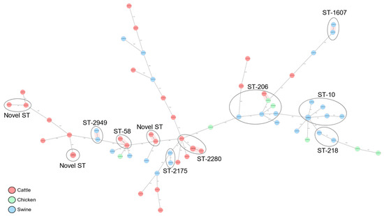 cgMLST-based minimum spanning tree of 63 commensal E. coli isolates recovered from cattle, swine, and chicken slaughter places in Kampala. Isolates belonging to the same dominant sequence types (ST) are circled and labeled and the hosts of origin are shown in different colors.