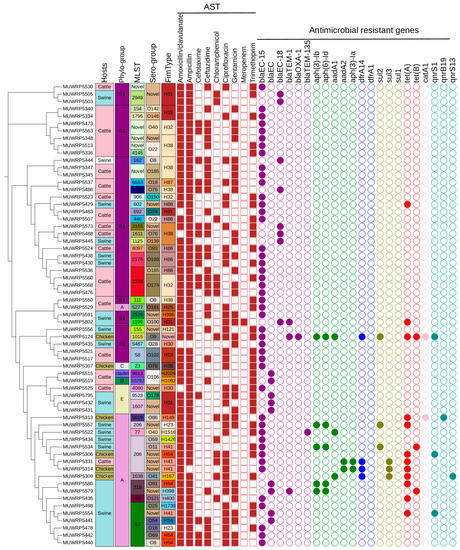SNP-based phylogenetic tree of 63 E. coli strains analyzed in this study characterized by phylogroup, sequence type (ST), isolation sources, and sample location with the corresponding antimicrobial resistance genes (absent, open circle; present, filled colored circle according to the class of AMR genes).