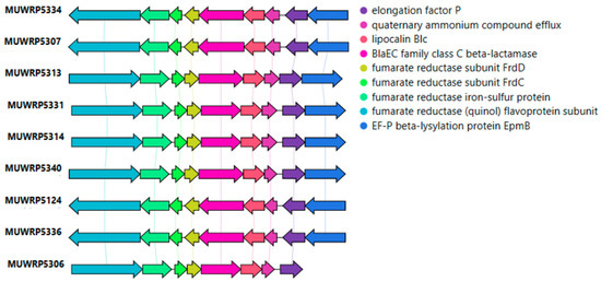 None of the blaEC-15 genes were located within the plasmid. However, the blaEC-15 genes were bordered by the fumarate reductase gene cluster upstream and the lipocalin (Figure 3). The blaEC-15 gene was also in close association with the gene for quaternary ammonium compound efflux (Figure 3). Only two isolates were detected with plasmid contigs carrying antimicrobial-resistant genes. The isolate MUWRP5802 was found to have a plasmid contig with blaTEM-1B gene. The second isolate MUWRP5306 had a plasmid fragment that carries tet(A) and qnrS1 antimicrobial resistant genes.