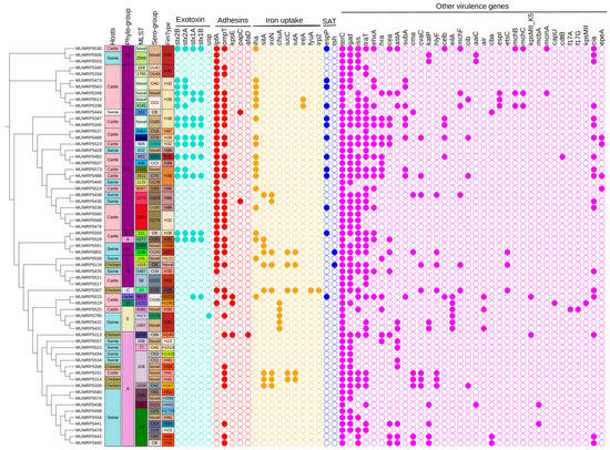 A SNP-based phylogenetic tree showing the distribution of virulent genes by phylogroup, sequence type (ST), serogroup, fimtype, and host (absent, open circle; present, filled colored circle according to the virulent genes).