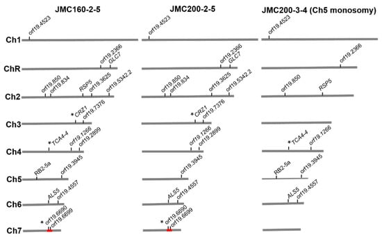 Distribution of shared mutations over chromosomes of caspofungin-adapted mutants JMC160-2-5, JMC200-2-5, and JMC200-3-4. * Indicates the presence of shared mutations in both alleles of a gene or in both copies of a genomic feature. Red block represents a 38 kb mutation prone region on Ch7 (see Figure 2). For more details, see Table 2 and Table S2.