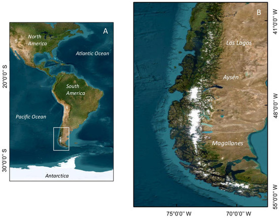 Map showing (A) South America; (B) Chilean Patagonia, where the impacts of HAB events have been most severe. The administrative regions (Los Lagos, Aysén, and Magallanes) are indicated.