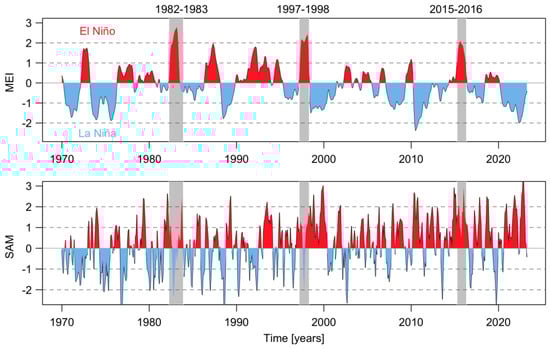Temporal evolution of the 3-month running mean of the Multivariate ENSO Index (MEI) version 2 (MEI.v2) and the Southern Annular Mode (SAM) from January 1970 to April 2023. The gray rectangle shows the more intense ENSO in a positive phase.