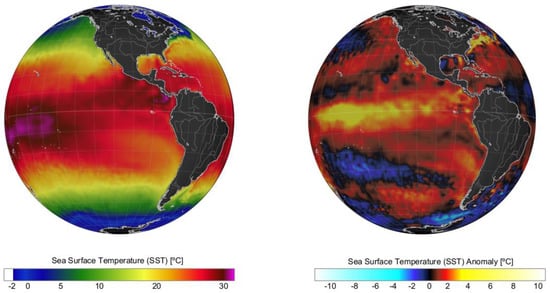 Sea surface temperature (SST, left panel) and SST anomalies (right panel) recorded on a global scale in January 2016 during an intense El Niño. Data obtained from the US National Weather Service.