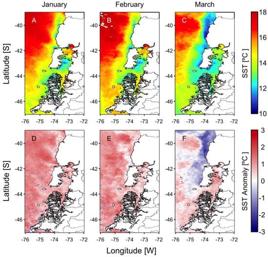 Monthly sea surface temperature (SST, (A–C) upper panels) and SST anomalies ((D–F) lower panels) from January to March. Anomalies were computed with the 2003–2015 monthly means from MODIS images.