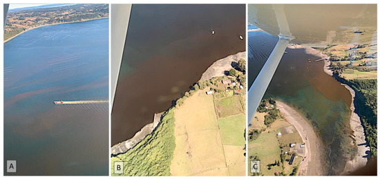 (A–C) Red tide caused by Heterosigma akashiwo. The aerial photos were taken over the Chiloé Inland Sea in March 2022.