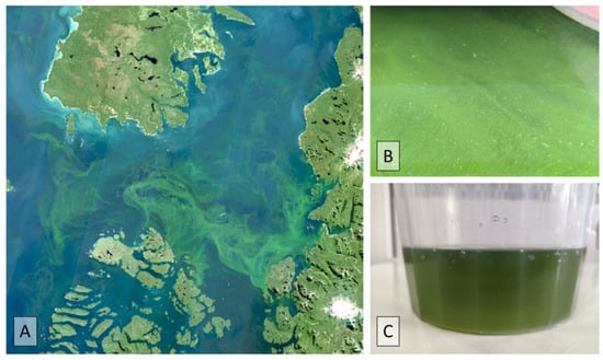 (A) True-color Sentinel-2 satellite image of green filaments observed in Corcovado Gulf, Southern Chile; (B) green filaments of L. chlorophorum, and (C) water sample from Tenglo Channel, city of Puerto Montt.
