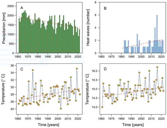 Climatological parameters recorded at the meteorological station located at Tepual airport, Puerto Montt, from 1961 to 2022: (A) total precipitation; (B) number of heat waves; (C) maximum air temperature; (D) mean temperature.