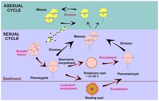 Dinoflagellates grow mainly by asexual reproduction and mitosis, but, under certain environmental conditions, they enter a sexual cycle (Figure 8) that allows them to dominate other microalgae, such as diatoms, due to the resulting higher growth rates []. A sexual life cycle includes the formation of benthic resting cysts, the germination of which serves as a new inoculum of vegetative cells and promotes new, recombinant genotypes that maximize the likelihood of population success under different environmental conditions. As resting cysts are highly resistant to adverse environmental conditions and remain viable in the sediments for long periods of time, sexual reproduction (genotype variability) that includes resting cyst production (environmental resistance) enables the successful invasion of new regions and habitats. Although very little research has been performed thus far, climate change is expected to impact the sexual cycle of dinoflagellates, including the formation and germination of resting cysts. For example, under laboratory conditions, a combination of high temperature and low salinity increased the rates of zygote formation [,] and resting cyst germination [] in Alexandrium and Gambierdiscus. While the germination rate is constricted by species-specific temperature windows, it generally increases at the higher end of that range []. The sexual encystment of A. catenella is also enhanced by rising temperatures []. In contrast to previous assumptions that sexuality in dinoflagellates was sporadic and unidirectional, recent studies have shown that is in fact both frequent and plastic [,], suggesting an essential role of life cycle transitions in the environmental adaptation and competitive success of these organisms.
