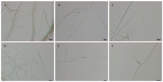 Morphological characteristics of C. gloeosporioides mycelium. (A–C) C. gloeosporioides mycelial morphology on PDA medium alone, 6 days after inoculation; (D–F) C. gloeosporioides mycelial morphology co-cultured with B. velezensis on PDA medium, 6 days after inoculation. Scale bars: (A,C,D,F) = 10 μm; (B,E) = 20 μm.