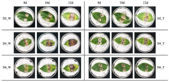 Changes in the infectivity of C. gloeosporioides on walnut leaves after co-cultivation with B. velezensis for different durations. D2_W, D4_W, and D6_W represented the infection of C. gloeosporioides on walnut leaves cultured alone for 2, 4, and 6 days, respectively. D2_T, D4_T, and D6_T represent the infection of walnut leaves by C. gloeosporioides after co-culturing with B. velezensis for 2, 4, and 6 days, respectively. 8d, 10d and 12d represent the infection results of leaves on the 8th, 10th, and 12th day, respectively. Each treatment and control had three replicates.