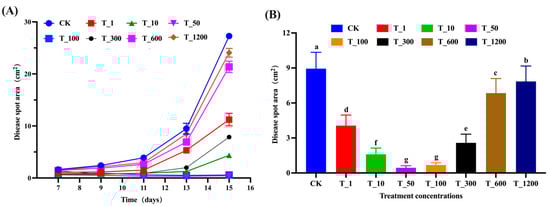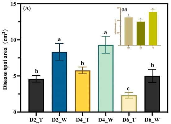 Lesion area and inhibition rate. (A) Lesion areas of leaves in three control and three treatment groups measured on the 12th day after infection; (B) Inhibition rate results calculated from the lesion areas measured on the 12th day. Data were analyzed using a one-way ANOVA test for comparison between groups, revealing a statistically significant difference between the groups (p < 0.05). Bars above columns represent standard errors. Different letters indicate significant differences between the treatments (p < 0.05).