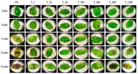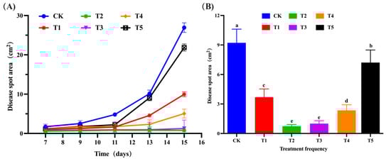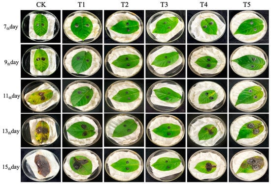 After determining the optimal control concentration, the experiment was conducted using 5 spray frequencies: every 1 day (namely T1 group), 2 days (namely T2 group), 3 days (namely T3 group), 4 days (namely T4 group), and 5 days (namely T5 group). The CK group was sprayed daily with LB liquid medium as a control. The leaves were sprayed at the same time each day, using the best spray concentration (50 times). In between treatment sprays, all groups received LB liquid medium. The detailed processing methods are shown in Table S2 (provided in Supplementary Materials). Each group had 3 replicates, and the experiment lasted for 15 days, with leaf lesion area changes observed and recorded.