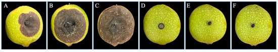 Control effect of B. velezensis on C. gloeosporioides in walnut fruit. (A–C) the control group; (D–F) the treatment group; (A,D) photographed on the 14th day; (B,E) photographed on the 16th day; (C,F) photographed on the 18th day.