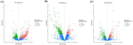 Volcano plot of DEGs in compared groups. (A) D2_DvsD2_CK group; (B) D4_DvsD4_CK group; (C) D6_DvsD6_CK group. Note: D2_DvsD2_CK, D4_DvsD4_CK, and D6_DvsD6_CK groups represent the comparisons between B. velezensis cultured alone for 2, 4, and 6 days, respectively, and B. velezensis co-cultured (confrontation with C. gloeosporioides) for the same duration. DEGs were selected based on the criteria of p < 0.05 and |log2FoldChange| > 0. The X-axis (log2FoldChange) indicates the fold change in gene expression, and the Y-axis (−log10(p-value)) represents the significance level of gene expression differences among the groups. Red dots indicate upregulated genes, green dots indicate downregulated genes, and blue dots represent genes with no significant expression changes.