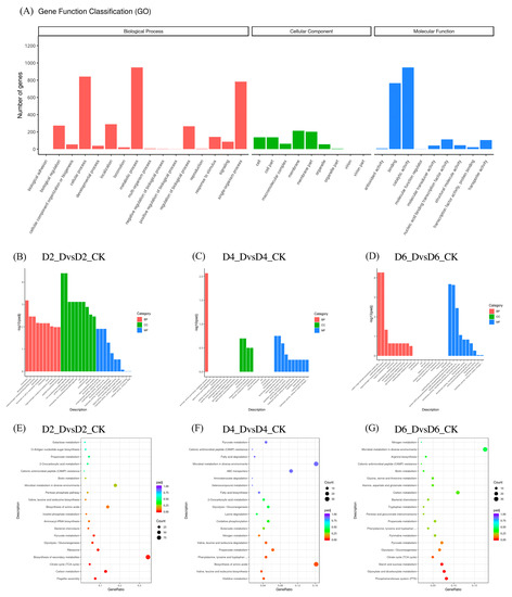 Histogram of GO functional enrichment analysis and bubble chart of KEGG pathway enrichment analysis of DEGs in compared groups. Note: (A–D) Histogram of GO functional enrichment analysis of DEGs in compared groups; (A) Functional classification of overall DEGs; (B) D2_DvsD2_CK group; (C) D4_DvsD4_CK group; (D) D6_DvsD6_CK group. In graphs (A–D), the x-axis represents GO Terms, and the y-axis represents the significance level of GO Term enrichment, represented as −log10(padj). Different colors denote distinct functional categories: red for biological processes, green for cellular components, and blue for molecular functions. (E–G) Bubble chart of KEGG pathway enrichment analysis of DEGs in compared groups; (E) D2_DvsD2_CK group; (F) D4_DvsD4_CK group; (G) D6_DvsD6_CK group. The bubble chart shows the top 20 significantly enriched KEGG pathways. The x-axis represents the ratio of differentially expressed genes annotated to each pathway to the total differentially expressed genes. The y-axis represents the KEGG pathways, with bubble size indicating the number of annotated genes. Larger circles denote more enriched differentially expressed genes. The color gradient (red to purple) represents the enrichment significance.