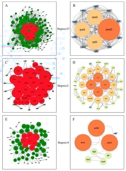 PPI network diagram results. (A,B) D2 Dvs D2 CK group; (C,D) D4 DvsD4 CK group; (E,F) D6 DvsD6 CK group.