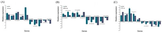Histogram of relative expression of DEGs by qRT-PCR and transcriptome analysis. (A) D2 DvsD2 CK group; (B) D2_DvsD2 CK group; (C) D2 DvsD2 CK group.
