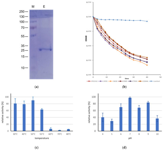 The ORF16 of virus Hadban encodes a protein 221 aas long (23.3 kDa) in whose N-part within amino acid positions 4–142 a domain of the M23 family metallopeptidase was found and in whose C-part within amino acid positions 180–214 a putative peptidoglycan-binding protein (pfam01471) was found. This protein is, therefore, presumably an endolysin of this virus. The putative endolysin of the related Arthrobacter virus Atraxa (ORF 15) has a similar domain structure, but it is smaller (a protein 207 aas long) and has an amino acid sequence identity of 47.3% with the endolysin of virus Hadban. Decurroviruses’ endolysins are 149 aas long and have the metallopeptidase domain only [31]. The recombinant endolysin of virus Hadban (Figure 4a) was active with all P. aeruginosa strains tested, including the strains CCM 3630 and DCMZ 22644, which were not lysed by the complete virus (Figure 4b). There were no significant differences between the strains. It also lysed both Arthrobacter strains under the same experimental conditions. The enzyme was active up to 55 °C, although its activity at 55 °C was only about 60% of the maximum activity reached at 50 °C (Figure 4c), and it functioned in the pH range of 6–9 (Figure 4d).