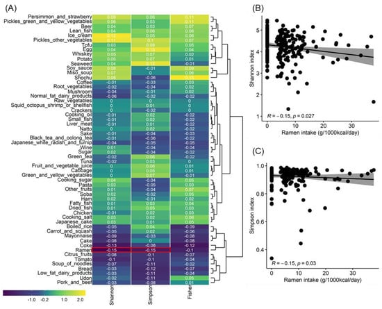 Correlation analysis results between gut bacterial alpha diversity and food intake. (A) This heat map shows the results of the correlation analysis between gut bacterial alpha diversity and food intake. The colors are coded according to Spearman’s correlation coefficient, with the red box representing a significant correlation (p value < 0.05). (B) Scatter plots based on the Shannon index and ramen intake. (C) Scatter plots based on the Simpson index and ramen intake.