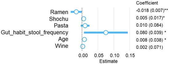 We performed an analysis considering multicollinearity to further clarify the relationship between alpha diversity and ramen intakes obtained from the correlation analysis. As predictors of the Shannon index, ramen intake was extracted as a negative factor, and Shochu, pasta, wine intake, and age were extracted as positive factors using the stepwise method (Figure 2). In this model, ramen intake was significantly inversely correlated, and Shochu intake, stool frequency, and age were significantly positively correlated with the Shannon index (β = −0.018 for ramen intake, β = 0.005 for Shochu intake, β = 0.08 for gut habit stool frequency, and β = 0.008 for age). Among these factors, ramen intake was found to be the most influential on the Shannon index. The relationship between ramen intake and Shannon index was also confirmed to be significant in the multiple linear regression model by setting age, BMI, defecation frequency, and stool shape as confounding factors (p = 0.032) (Table S2).