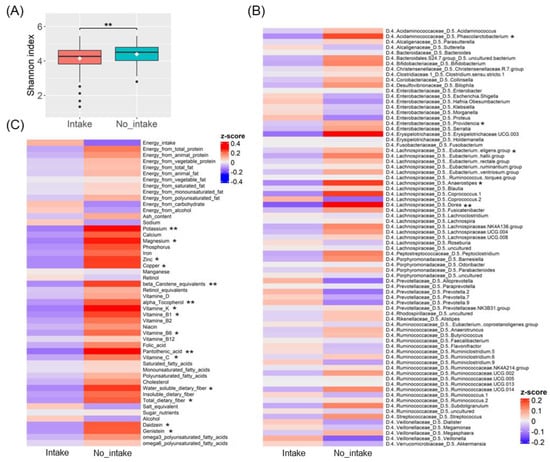 Comparison between two groups separated according to ramen intake. (A) Comparison of Shannon index between intake and no_intake groups using the Wilcoxon rank sum test. (B) A z-score heat map comparing bacterial genus relative abundance between intake and no_intake groups using the Wilcoxon rank sum test. (C) A z-score heat map comparing nutrient intake between intake and no_intake groups using the Wilcoxon rank sum test. ** p value < 0.01, * p value < 0.05.
