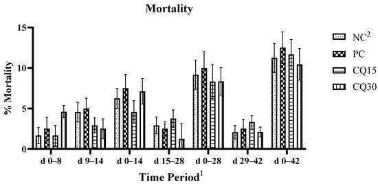 The mortality rate is presented in Figure 1. There were no statistical differences amongst treatments; however, both CQ-supplemented treatments showed a reduction in percent mortality compared to NC and PC.