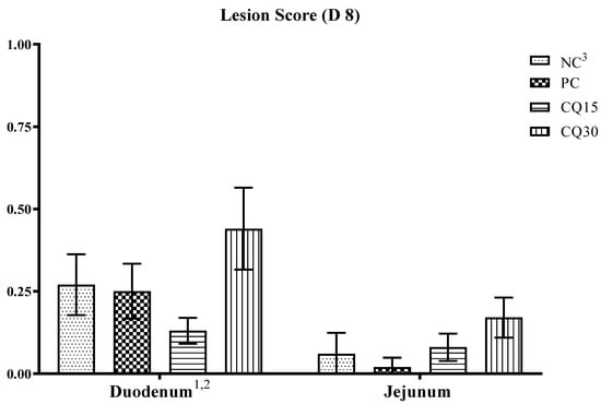 The effect of the dietary supplementation of the saponin-based product Clarity Q on necrotic lesions is presented in Figure 2. On d 8, although there were no statistical differences in lesion scores amongst treatments, CQ15 and PC supplements reduced NE lesions in the duodenum and jejunum, respectively, compared to all other treatments.