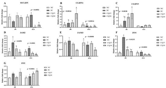Relative mRNA abundance of tight junction proteins in the jejunum of broiler chickens on d 8 and d 14 during a 42 d NE challenge. Numbers with different letters (a–d) differ significantly (p < 0.05). Values are represented as n-fold difference relative to the calibrator (NC). (A–G) Each bar represents the mean ± SE values of 10 replicate pens of one bird/pen. (A–G) Occludin (OCLN), claudins (CLDN) 1 and 5, junctional adhesion molecules (JAMs) 2 and 3, and zonula occludens (ZO) 1 and 2. Treatments included negative control (NC) as corn–soybean meal basal diet, positive control (PC) as NC + 50 g/MT of BMD, and NC + 15 or 30 g/MT of Clarity Q (CQ15 and CQ30, respectively).