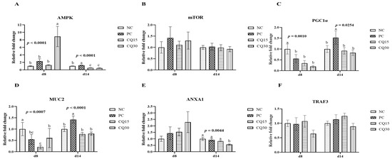 Relative mRNA abundance of signaling pathways and mucin in the jejunum of broiler chickens on d 8 and d 14 during a 42 d NE challenge. Numbers with different letters (a–c) differ significantly. (p < 0.05). Values are represented as n-fold difference relative to the calibrator (NC). (A–F) Each bar represents the mean ± SE values of 10 replicate pens of one bird/pen. (A–F) Adenosine monophosphate-activated protein kinase (AMPK), mammalian target of rapamycin (mTOR), peroxisome proliferator-activated receptor-gamma coactivator one alpha (PGC1α), mucin 2 (MUC2), annexin 1 (ANXA1), and TNF receptor 3 (TRAF3). Treatments included negative control (NC) as corn–soybean meal basal diet, positive control (PC) as NC + 50 g/MT of BMD, and NC + 15 or 30 g/MT of Clarity Q (CQ15 and CQ30, respectively).