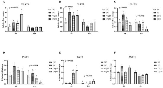 Relative mRNA abundance of nutrient transport genes of broiler chickens on d 8 and d 14 during a 42 d NE challenge. Numbers with different letters (a–c) differ significantly. (p < 0.05). Values are represented as n-fold difference relative to the calibrator (NC). (A–F) Each bar represents the mean ± SE values of 10 replicate pens of one bird/pen. (A–F) Excitatory amino acid transporter 3 (EAAT3), glucose transporter (GLUT) 2 and 5, peptide transporter (PepT) 1 and 2, sodium-dependent glucose co-transporter 1 (SGLT1). Treatments included negative control (NC) as corn–soybean meal basal diet, positive control (PC) as NC + 50 g/MT of BMD, and NC + 15 or 30 g/MT of Clarity Q (CQ15 and CQ30, respectively).