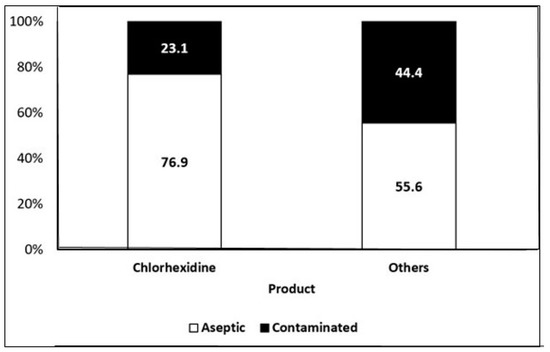 Association of frequency of contamination in relation to the asepsis product. (chlorhexidine and other products).